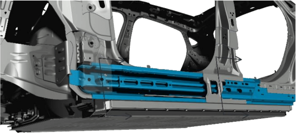 Electric Vehicles present several challenges to firefighters with battery fires leading the way. The automakers are designing and engineering extremely strong protective cages around battery packs. We are no strangers finding boron, martensite, and press hardened steels in the pillars, roof rails, and fender wells. However, in a BEV, the rocker panels and cross vehicle reinforcements will have boron and martensite steels to protect the battery pack from collisions that could comprise it. In the images below, the 2021 Ford Mustang Mach E has this strong steel in the rocker panels and cross vehicle reinforcements. The automakers can tie in the strong rocker panels into the front fender wells requiring us to make deep cuts during a dash lift or roll.