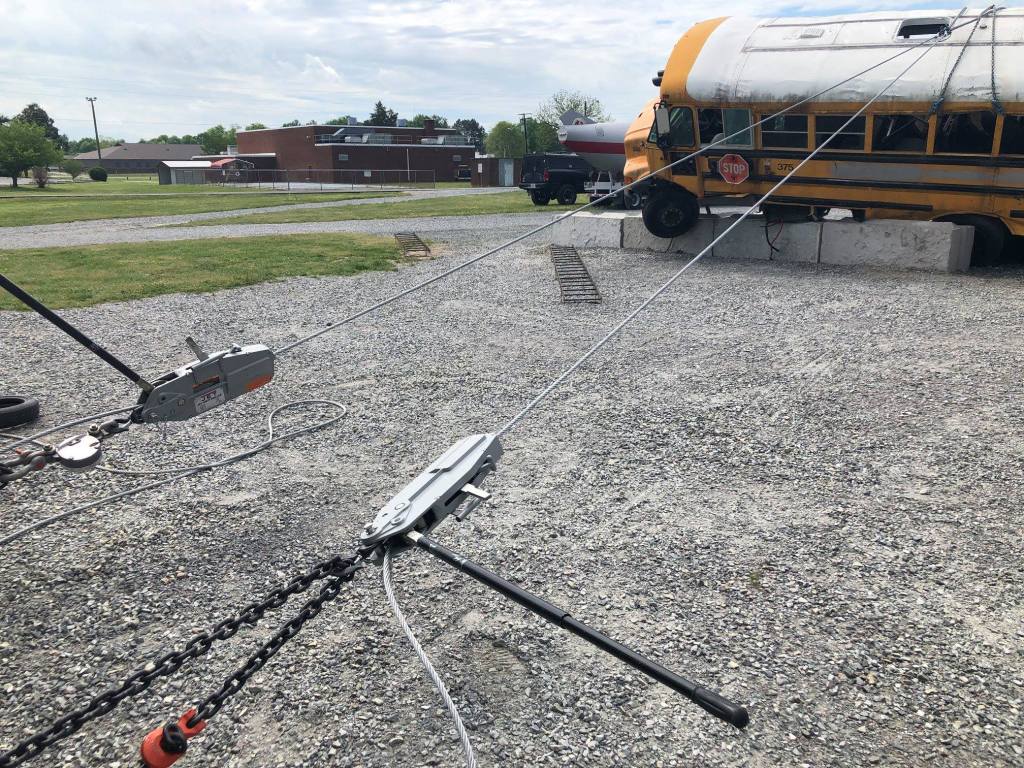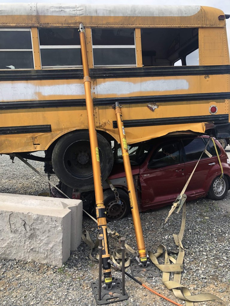 The bus was captured with struts for stabilization. The black guard rails on school buses are strong points for struts tips for stabilization and lifting.
