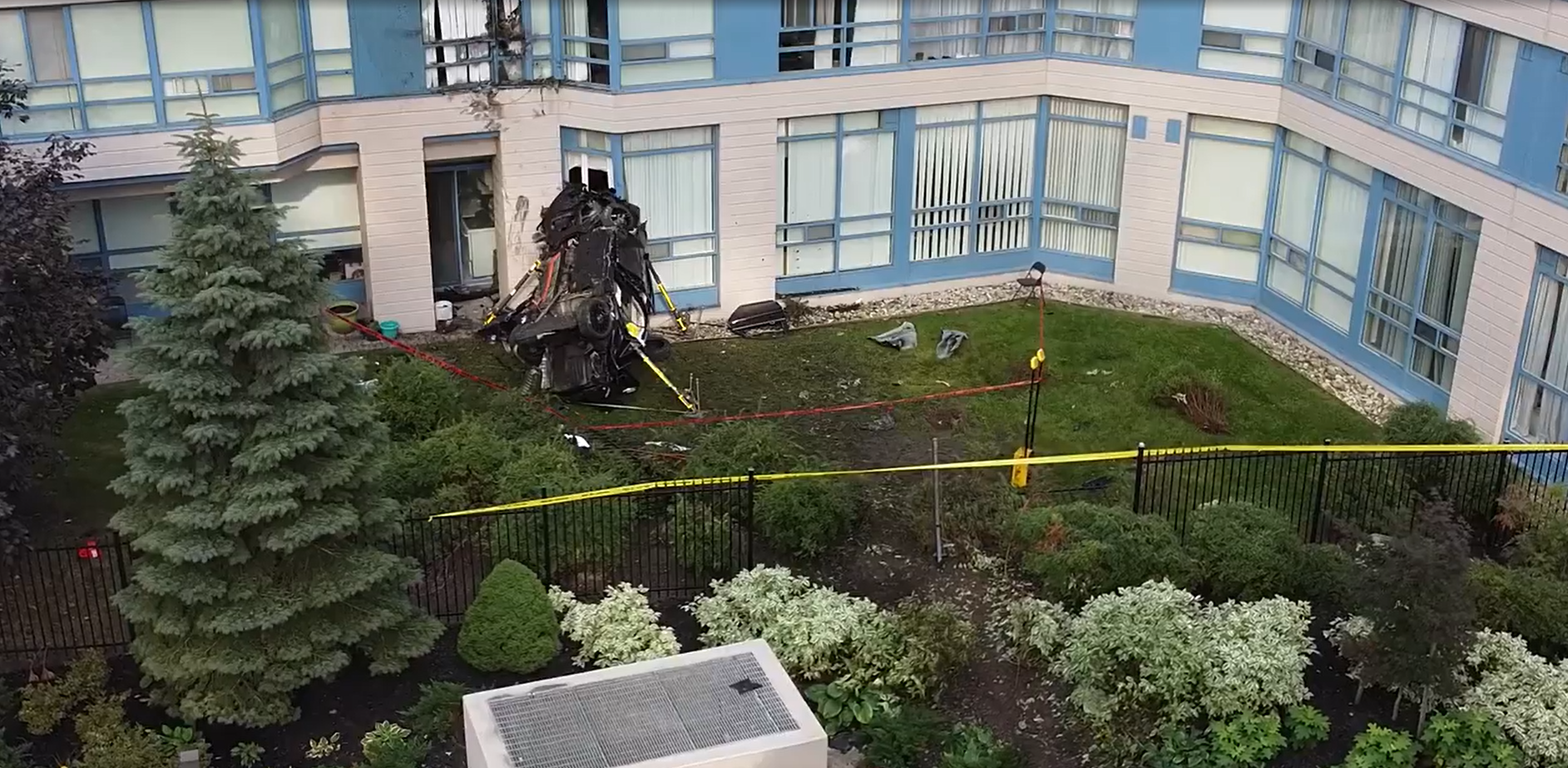 In Mississauga, Canada, a vehicle crashed into a large residential building and the damage could have impacted up to 4 stories. Mississauga Fire and Emergency Services stated the vehicle hit the window on the building’s second floor. The driver was extricated and transported to the hospital.