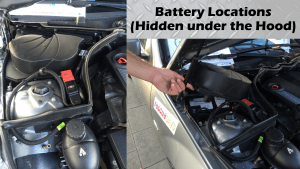 The screenshot below shows the location of the 12 volt battery in the 2016 Mercedes Benz C-Class. Luxury vehicles, will often have plastic covers over the 12 volt battery and other components in the engine compartment.